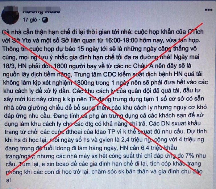Trước đó, tại cuộc họp Ban chỉ đạo phòng chống dịch Covid-19, bà Nguyễn Thị Mai Hương - Phó Giám đốc sở Thông tin và Truyền thông Hà Nội cho biết, hiện nay không phải chỉ xuất hiện tin đồn trên mạng mà còn xuất hiện trong các nhóm kín, việc kiểm soát thông tin rất khó khăn, nhất là trong hội nhóm các bà mẹ bỉm sữa, các phụ huynh học sinh. Họ trao đổi với nhau rất khó phát hiện.