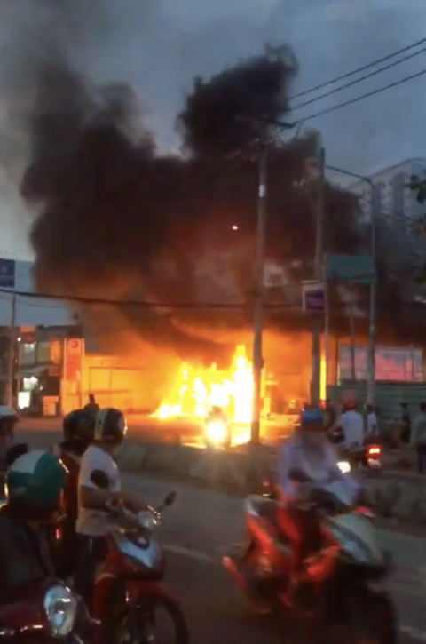 Quá hoảng sợ, nhiều người đang đậu ô tô, xe máy để bơm xăng nhấn ga tháo chạy. Khói đen bốc lên nghi ngút, khu dân cư cạnh cây xăng hốt hoảng dọn đồ đạc.