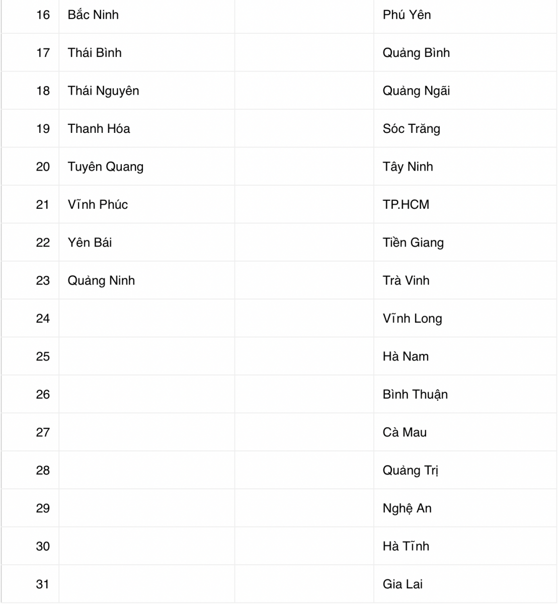 23 tỉnh thành cho 100% học sinh đến trường học trực tiếp là những địa phương thuộc "vùng xanh" gồm: Bắc Giang, Bắc Kạn, Bình Định, Cao Bằng, Điện Biên, Hà Giang, Hải Dương, Hải Phòng, Hoà Bình, Kon Tum, Lai Châu, Lào Cai, Nam Định, Ninh Bình, Phú Thọ, Bắc Ninh, Thái Bình, Thái Nguyên, Thanh Hoá, Tuyên Quang, Vĩnh Phúc, Yên Bái, Quảng Ninh.