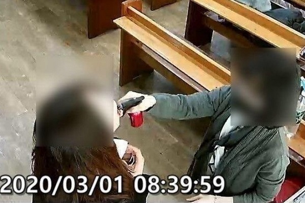Hình ảnh từ clip quay tại nhà thờ cho thấy 1 thành viên nhà thờ đưa vòi bình xịt vào sâu trong miệng của từng người trong buổi lễ có khoảng 100 thành viên tham dự từ ngày 1-8/3. Trong số những người mắc Covid-19 có cả vợ chồng mục sư.