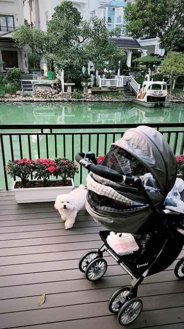 Bên cạnh đó, không gian sân vườn lãng mạn ven sông tại tư gia nhà chồng Tú Anh cũng được nhận xét là rất "nên thơ". Đây cũng là nơi nàng hậu hay đưa con ra thư giãn, tắm nắng.