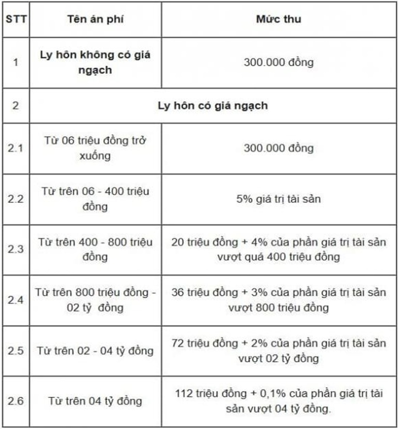 Lưu ý: Nếu yêu cầu ly hôn được giải quyết theo thủ tục rút gọn thì vợ chồng phải chịu mức án phí bằng 50% mức án phí nêu trên.
