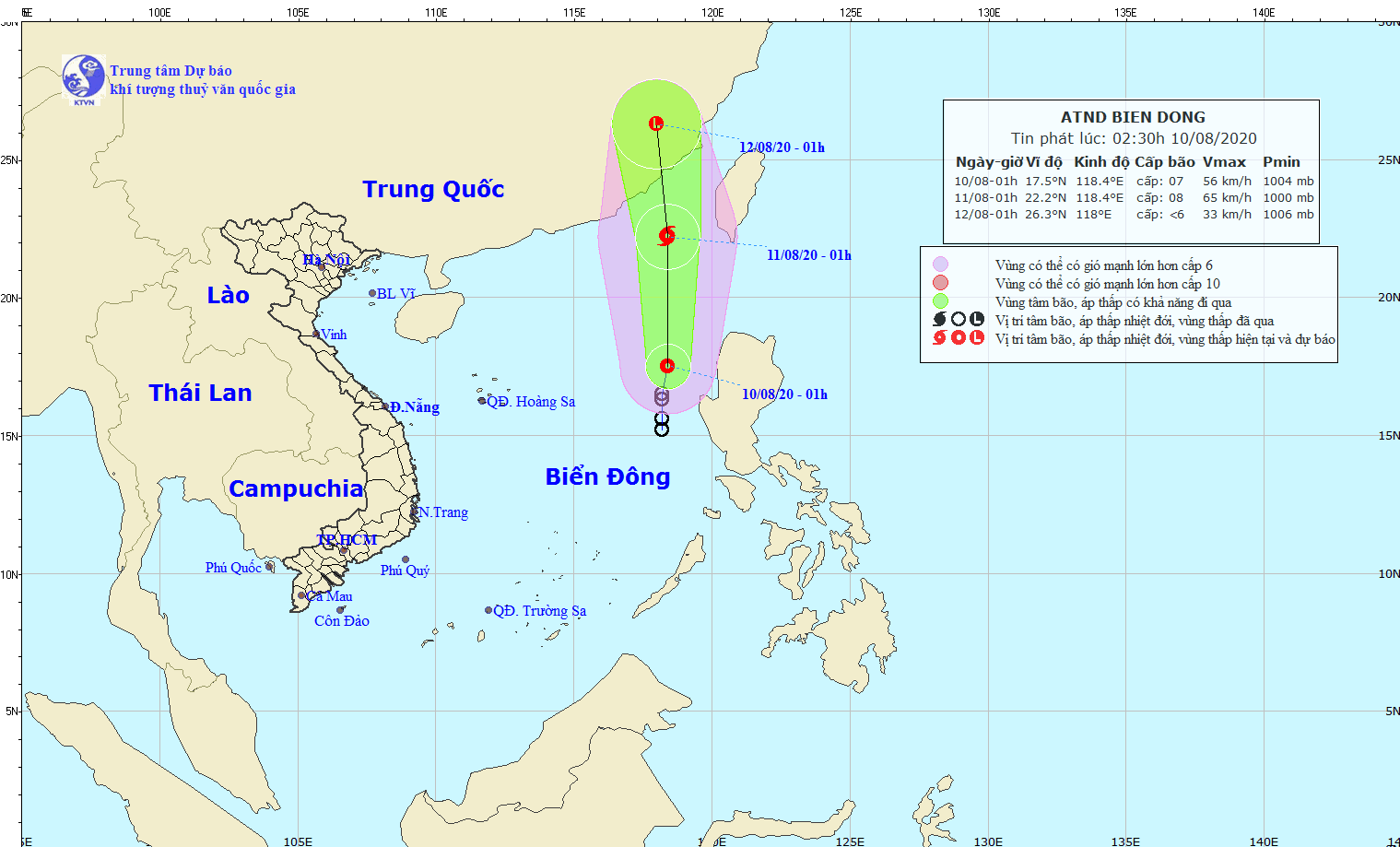 Theo Trung tâm dự báo khí tượng thủy văn quốc gia, vào hồi 01 giờ ngày 10/8, vị trí tâm áp thấp nhiệt đới ở vào khoảng 17,5 độ Vĩ Bắc; 118,4 độ Kinh Đông, cách phía Bắc đảo Lu-dông (Phi-líp-pin) khoảng 180km về phía Tây. Sức gió mạnh nhất vùng gần tâm áp thấp nhiệt đới mạnh cấp 6-7 (40-60km/giờ), giật cấp 9. Bán kính gió mạnh từ cấp 6 trở lên khoảng 100km tính từ tâm áp thấp nhiệt đới.