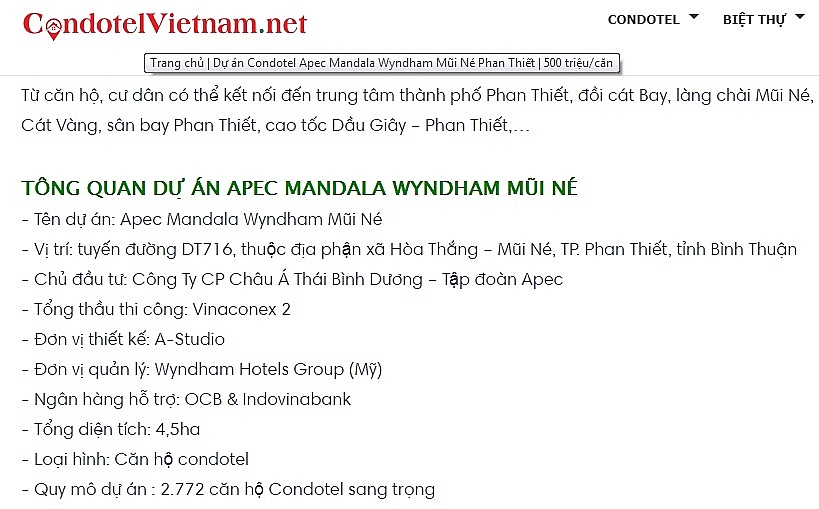 Được biết, dự án Khu du lịch nghỉ dưỡng Apec Mandala Wyndham Mũi Né do Công ty Cổ phần Đầu tư IDJ Việt Nam (công ty con của Apec Group) hoạt động dưới hình thức Condotel. Được quảng cáo là có thiết kế ấn tượng, cơ cấu căn hộ linh hoạt, dòng sản phẩm đa dạng, tiêu chuẩn nghỉ dưỡng đồng bộ theo chuẩn quốc tế, quản lý bởi Wyndham Mỹ, suất đầu tư vừa miếng, chính sách bán hàng thân thiện, tiềm năng gia tăng giá trị lớn - là sản phẩm nghỉ dưỡng tiên phong tại Bình Thuận, tạo ra xu hướng và làn sóng đầu tư mới.