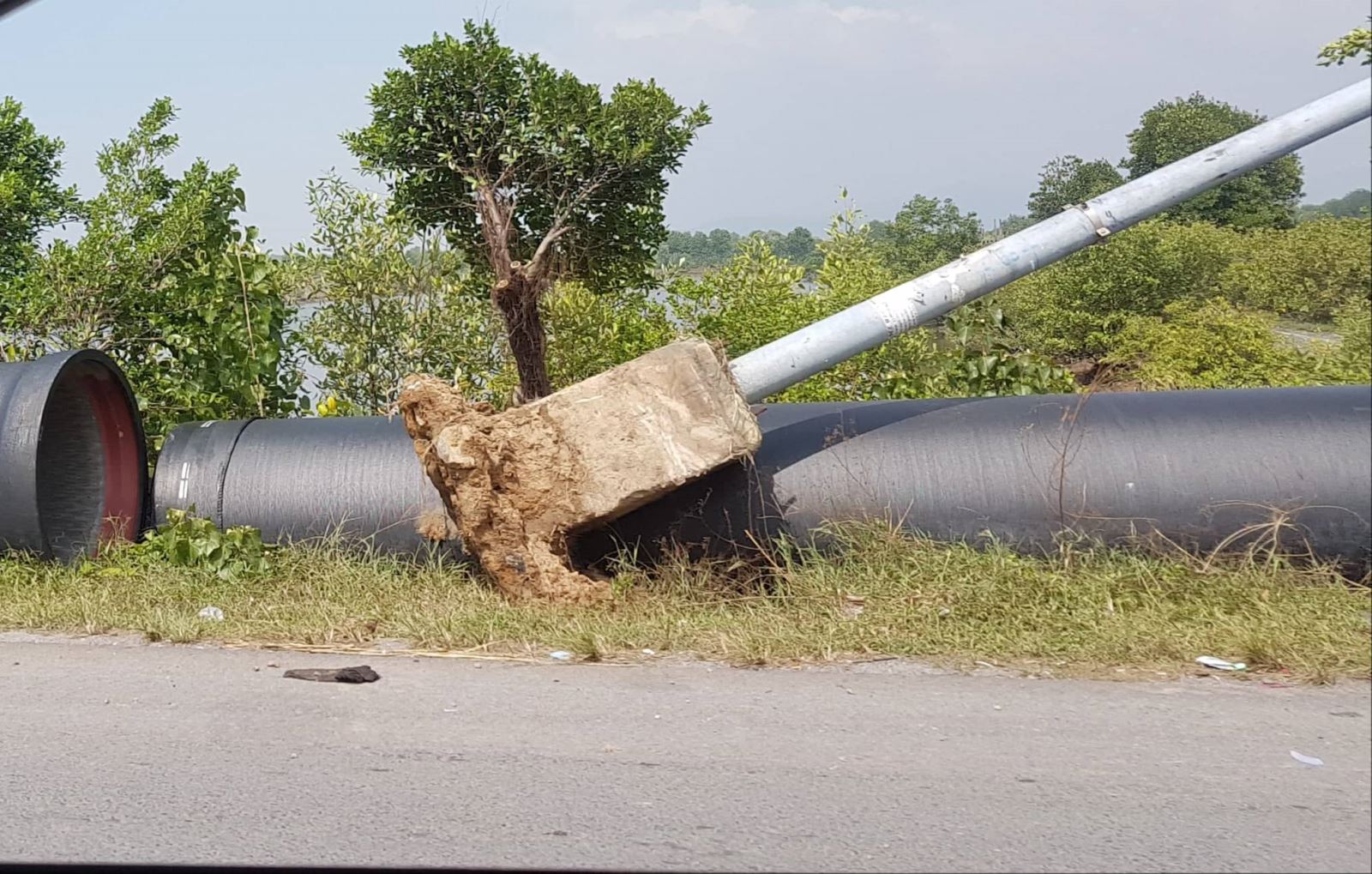 Ngoài ra, PV cũng ghi nhận được thêm việc đơn vị thi công khi tiến hành đào đường để thi công hệ thống ống nước đã tiến hành nhổ lần lượt từng cột đèn đường dùng để chiếu sáng đô thị, nhưng việc thi công hoàn trả lại đối với hệ thống chiếu sáng này lại được tiến hành một cách rất sơ sài bằng việc lấp đất để chôn lại chứ không hề được đổ bê tông để gia cố một cách chắc chắn.