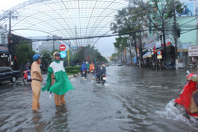 Đến 9 giờ sáng cùng ngày, tình trạng ngập nước vẫn xảy ra tại một số tuyến đường trong nội ô TP Bạc Liêu.