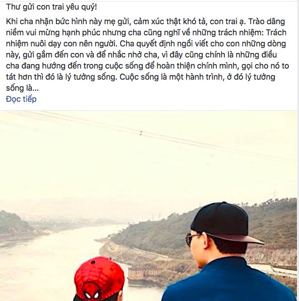 Cha quan tâm đến những điều tươi đẹp, những việc làm nhân văn, những câu chuyện xúc động và truyền cảm hứng... Cuộc sống áp lực từng ngày, cha không muốn tiếp nhận thêm những điều vụn vặt nhỏ nhen hay những scandal trong cuộc sống. Đó không phải là cha vô cảm với dân tộc, với xã hội, với đất nước… Lời đáp tốt nhất cho tình yêu quê hương đất nước chính là hãy làm tốt nhất công việc của mình và sống tử tế với mọi người. Cha thấy ngạc nhiên khi có rất nhiều người cuộc sống gia đình và công việc chưa đâu vào đâu những suốt ngày vẫn ngồi ý kiến người này, soi mói gia đình kia. Tuyệt đối con không được phép trở thành người như vậy, con trai nhé!