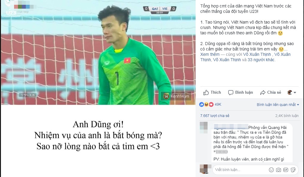 Trang Goal phiên bản tiếng Việt lấy hình ảnh thủ thành Tiến Dũng - người đã chơi chói sáng trong loạt penalty với dòng tít: “Tiến Dũng xuất thần, U23 Việt Nam vào chung kết châu Á”.