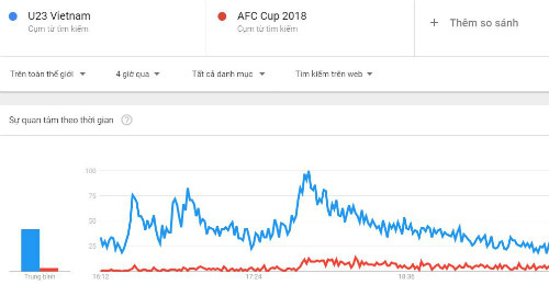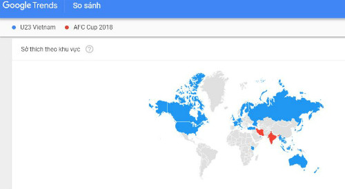 Không chỉ có thế, nếu so sánh mức độ tìm kiếm từ khóa “U23 Vietnam” (màu xanh) với từ khóa “AFC Cup 2018” (màu đỏ) còn có phần vượt trội hơn. Đặc biệt, bản đồ từ Google trends còn cho thấy dường như cả thế giới đang đổ dồn mối quan tâm về U23 Việt Nam. Trên bản đồ, những vùng màu xanh là nơi mà từ khóa “U23 Vietnam” được tìm kiếm nhiều, còn vùng màu đỏ là mức độ tìm kiếm về “AFC Cup 2018”. Như vậy, không chỉ có các nước Đông Nam Á, Châu Á mà một số quốc gia ở Châu Úc, Châu Mỹ, khu vực Trung Đông, các tiểu vương quốc Ả Rập... cũng có nhiều lượng tìm kiếm về U23 Việt Nam nhiêu vô số kể.