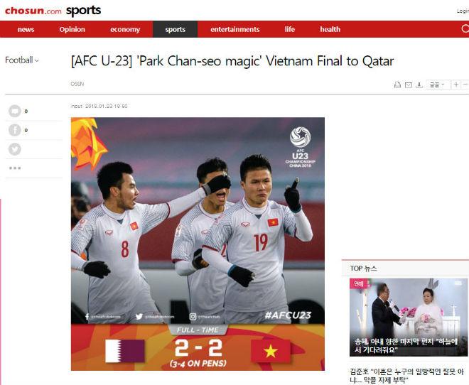 Trong khi đó, tờ Fox Sports phiên bản châu Á cũng dành những lời ca ngợi cho màn trình diễn thuyết phục của U23 Việt Nam. Tờ báo này cũng đưa chiến thắng nghẹt thở của U23 Việt Nam lên trang nhất, trong đó hình ảnh nổi bật nhất chính là Quang Hải.