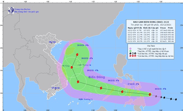 Theo Trung tâm Dự báo Khí tượng Thuỷ văn Quốc gia, hồi 7h ngày 16/12, vị trí tâm bão ở khoảng 9,7 độ Vĩ Bắc; 127,6 độ Kinh Đông, cách bờ biển miền Trung Phi-líp-pin khoảng 300km về phía Đông Đông Nam. Sức gió mạnh nhất vùng gần tâm bão mạnh cấp 14 (150-165km/giờ), giật cấp 17.