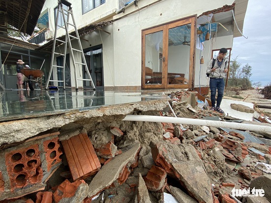 Khu nhà hàng của ông Nguyễn Văn Ba, khối Thịnh Mỹ bị sóng lớn, gió to vào đêm và rạng sáng nay đánh sập mái, công trình vệ sinh sạt xuống bờ biển. Theo chủ của villa này, vào rạng sáng nay do ảnh hưởng của bão khiến cột sóng rất cao, đánh vào khu vila khiến nhiều phòng bị sụp đổ xuống. "Phần tường và móng nứt toác, đổ vùi xuống, hư hỏng hoàn toàn, villa của chúng tôi bị thiệt hại quá nặng", chủ Vila cho biết.