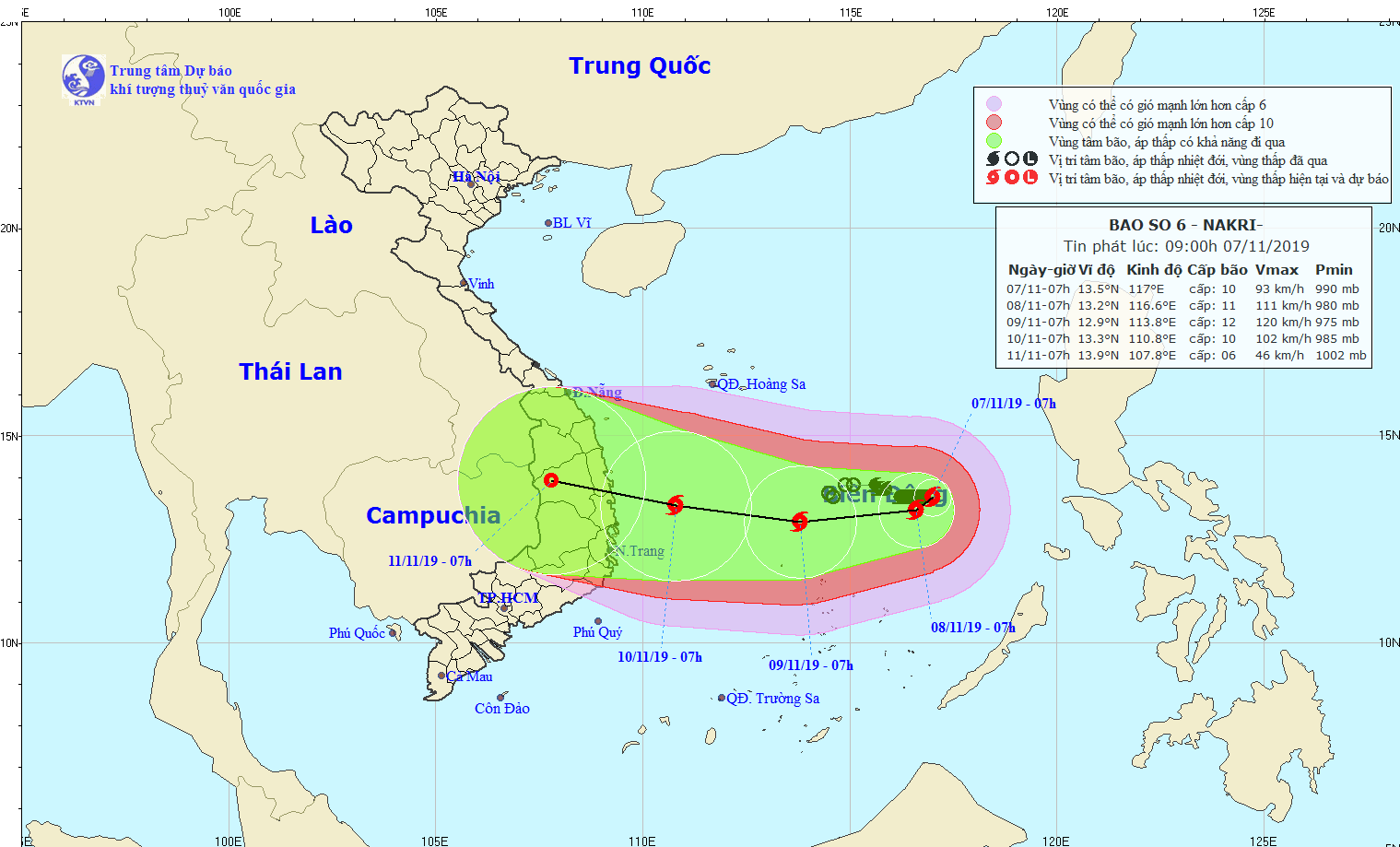Trong 48 đến 72 giờ tiếp theo, bão di chuyển theo hướng Tây Tây Bắc, mỗi giờ đi được 10-15km. Đến 07 giờ ngày 10/11, vị trí tâm bão ở khoảng 13,3 độ Vĩ Bắc; 110,8 độ Kinh Đông, cách đất liền các tỉnh Quảng Ngãi-Khánh Hòa khoảng 180km về phía Đông. Sức gió mạnh nhất vùng gần tâm bão mạnh cấp 10-11 (90-115km/giờ), giật cấp 13.