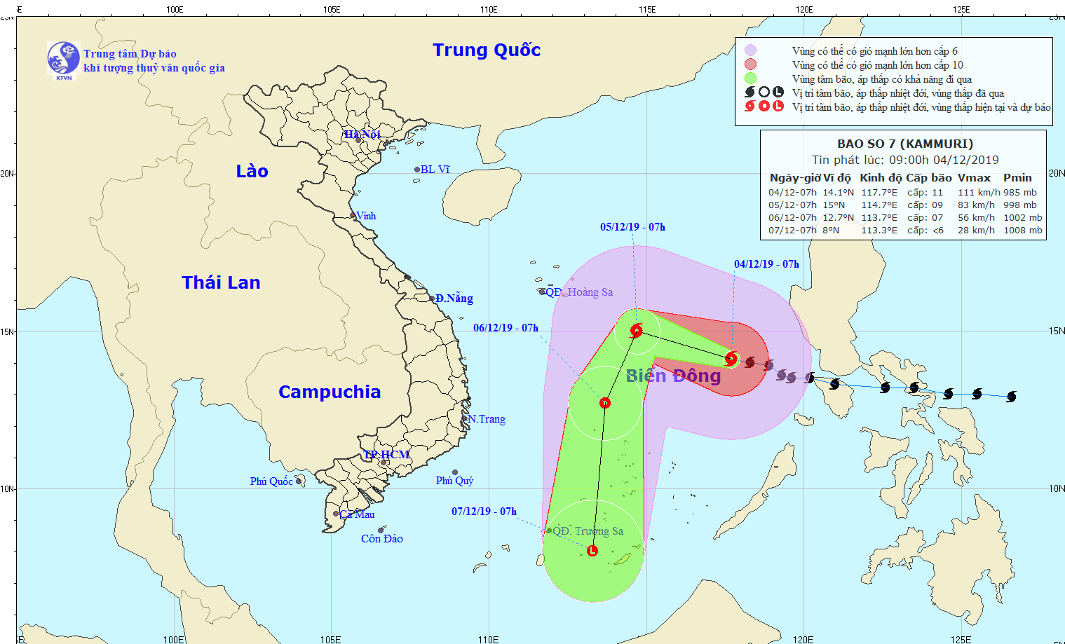 Dự báo trong 24 giờ tới, bão di chuyển theo hướng Tây Tây Bắc, mỗi giờ đi được khoảng 15km. Đến 07 giờ ngày 05/12, vị trí tâm bão ở khoảng 15,0 độ Vĩ Bắc; 114,7 độ Kinh Đông, cách đảo Song Tử Tây khoảng 400km về phía Bắc. Sức gió mạnh nhất vùng gần tâm bão mạnh cấp 8-9 (60-90km/giờ), giật cấp 11. Do ảnh hưởng của bão, vùng biển phía Đông khu vực Bắc và giữa Biển Đông có gió mạnh cấp 8-9, vùng gần tâm bão đi qua cấp 10-11, giật cấp 13; biển động dữ dội. Cấp độ rủi ro thiên tai: cấp 3.