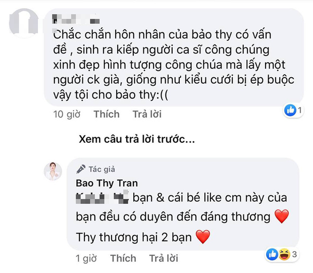 Cụ thể, một tài khoản mạng viết: "Chắc chắn hôn nhân của Bảo Thy có vấn đề, ca sĩ hình tượng công chúa mà lấy một người chồng già, giống như kiểu cưới bị ép buộc vậy. Tội cho Bảo Thy". Trước bình luận tiêu cực của dân mạng, bà xã đại gia Phan Lĩnh viết: "Bạn có duyên đến đáng thương, Thy thương hại bạn". Trước đó, Bảo Thy cũng nhiều lần lên tiếng, cô cho biết do ông xã không làm trong showbiz nên cả hai sẽ hạn chế chia sẻ cuộc sống riêng tư lên mạng xã hội.