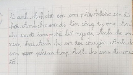 Cụ thể, nam sinh lớp 2 viết: "Gia đình em gồm 5 người. Em yêu nhất là anh. Anh cho em đi xem phim. Anh cho em đi chơi. Anh cho em đi lên công ty mẹ. Anh cho em đi sang nhà bà ngoại. Anh cho em xem hài. Anh cho em đọc truyện. Anh cho em xem phim hay. Anh cho em đi mua đồ".