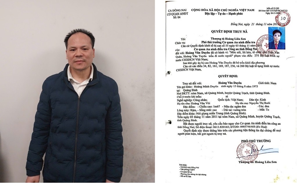 Theo Công an tỉnh Đồng Nai, ngày 15/4, qua công tác truy tìm, Phòng An ninh điều tra Công an tỉnh đã phối hợp Công an cửa khẩu Cảng hàng không quốc tế Đà Nẵng bắt giữ đối tượng truy nã Hoàng Văn Duyên (SN 1973, thường trú tại tỉnh Quảng Bình) khi đối tượng vừa nhập cảnh từ Hàn Quốc vào Việt Nam.
