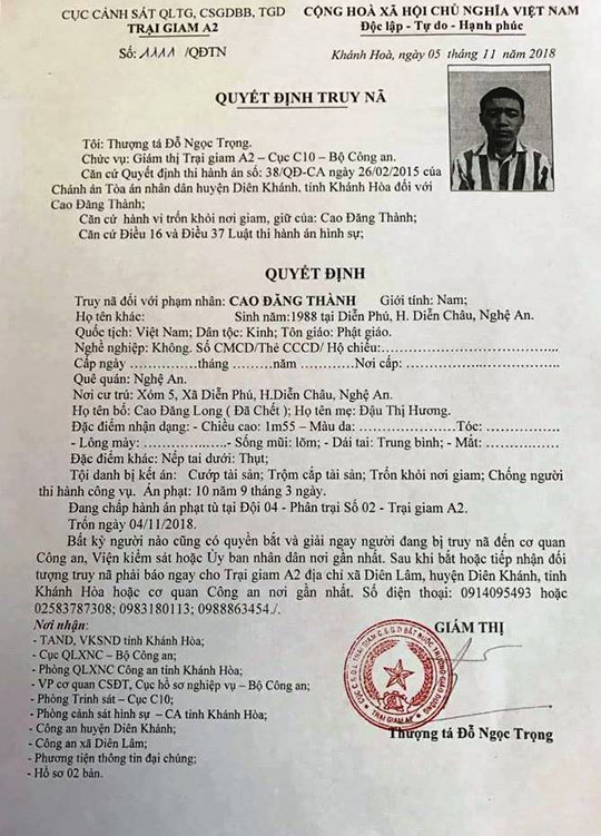 Vào lúc 20h ngày 6/11, thượng tá Đỗ Ngọc Trọng, Giám thị trại A2 thuộc Cục Quản lý trại giam, cơ sở giáo dục bắt buộc, trường giáo dưỡng (C10) – Bộ Công an ở xã Diên Lâm, huyện Diên Khánh, tỉnh Khánh Hòa, cho biết đã bắt được phạm nhân Cao Đăng Thành (30 tuổi, trú ở xóm 5, xã Diễn Phú, huyện Diễn Châu, tỉnh Nghệ An) sau 2 ngày trốn trại.
