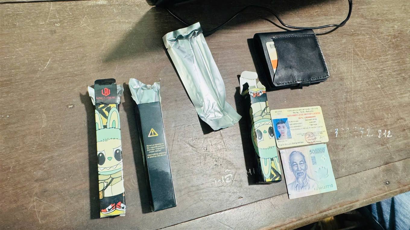 Ngay lập tức, Tổ công tác đã yêu cầu kiểm tra đối với người nam giới trên, qua kiểm tra phát hiện đối tượng đang đeo túi xách trên người có 3 ống Pod Chill hình trụ tròn, bên trên có dãn nhãn hiệu “KING LABUBU”, bên trong các ống có chứa chất ma túy theo như đối tượng khai nhận.