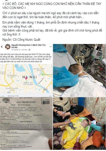"Chỉ vì phút sơ xảy của người mẹ khi ngủ say đè cả cánh tay vào con dẫn đến con bị ngạt thở, tím tái toàn thân, 40 phút mới phát hiện... Em phải nằm viện đúng 1 tháng, tim phổi ổn định nhưng chết não, 1 tháng nay con sống thực vật... Giờ bệnh viện đã trả về, gia đình chờ để rút ống thở..!!" - câu chuyện buồn của bé N.A. được chia sẻ đã nhanh chóng trên nhiều diễn đàn và mạng xã hội.