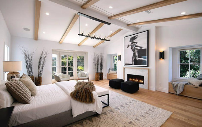 Phòng ngủ của vợ chồng Bieber có diện tích lớn trong ngôi nhà. Ngoại trừ sắc vàng từ sàn gỗ, gam màu trắng chiếm đa số trong phòng từ thảm trải, ga giường đến tranh treo tường.