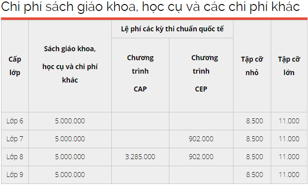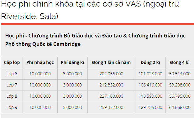 Trên trang web của VAS, học phí chính khóa bậc THCS năm học 2019-2020 (Chương trình Bộ Giáo dục và Đào tạo & Chương trình Giáo dục Phổ thông Quốc tế Cambridge) được niêm yết là 202.056.000 đồng ở khối lớp 6; lớp 7 là 212.832.000 đồng; lớp 8 là 227.180.000 đồng và lớp 9 là 259.472.000. Các bậc phụ huynh có thể đóng học phí theo kỳ hoặc cả năm.