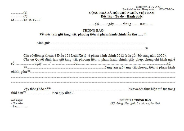 i) Thông báo tạm giữ tang vật, phương tiện vi phạm hành chính (Mẫu số 09/TB-TGTVPT);