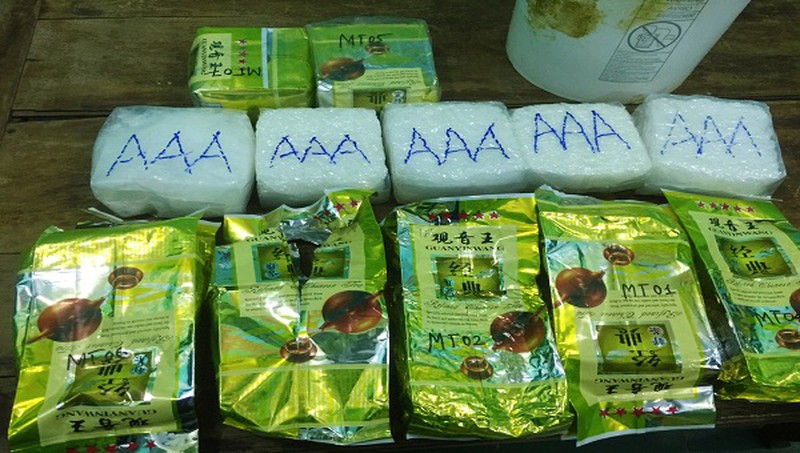 Các bánh heroin trôi dạt vào ven biển được đóng gói bằng bao nilon rất cẩn thận. Bên trong các lớp nilon có một lớp giấy màu vàng nhạt, trên bề mặt có một vòng tròn đỏ và nhiều chữ Trung Quốc.