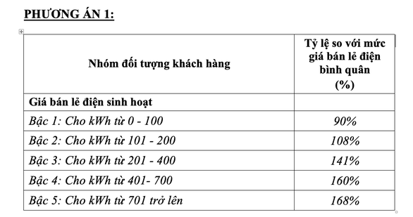 Với Phương án 1: Cơ cấu biểu giá bán lẻ điện cho mục đích sinh hoạt sẽ chỉ có 5 bậc. Bậc 1 áp dụng cho kWh từ 0 – 100 (gộp bậc 1 và 2 trong biểu 6 bậc và tăng từ 0-100kW) và tính bằng 90% mức giá bán lẻ điện bình quân. Bậc 2 áp dụng cho kWh từ 101 – 200 và tính bằng 108% mức giá bán lẻ điện bậc 3.