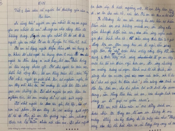 Theo chị Nguyệt Anh, mẹ Anh Thư, đây là đề bài bài tập làm văn giao về nhà của con gái. Anh Thư hiện theo học lớp bồi dưỡng Văn, sau khi xuất sắc vượt qua một kỳ thi hồi đầu năm của trường. Lớp này do một cô giáo dạy giỏi đã về hưu kèm cặp. Ngoài bài văn viết về bố, Anh Thư còn một số bài khác được đánh giá cao.