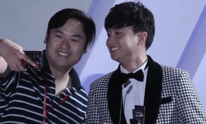 Cụ thể, trong lúc Quốc Trường đang phát biểu, một người đàn ông lạ mặt đã lên sân khấu và "thản nhiên" giơ điện thoại chụp ảnh "tự sướng" với nam diễn viên.