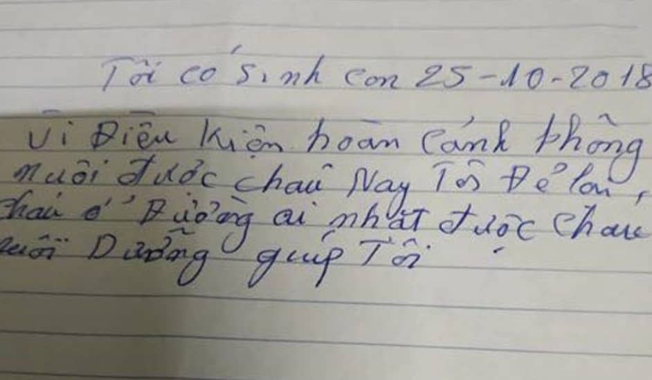 Tại thời điểm được người dân phát hiện, bé gái bị bỏ rơi được quấn trong tấm chăn dạ, đặt bên cạnh chiếc giỏ đựng quần áo và đồ dùng của trẻ sơ sinh. Kiểm tra, lực lượng chức năng phát hiện mảnh giấy, nội dung: "Tôi có sinh con 25/10/2018. Vì điều kiện không nuôi được, nay tôi để con ở lề đường ai nhặt được nuôi dưỡng giúp tôi...".