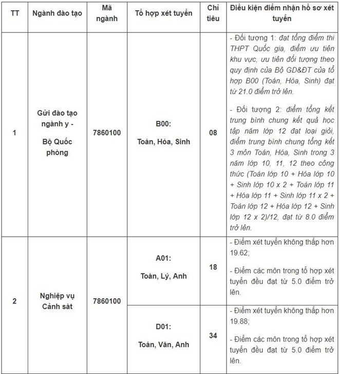 Đối với gửi đào tạo ngành Y (tổ hợp B00), đối tượng và điểm nhận hồ sơ giống Học viện Cảnh sát nhân dân. Theo đó, thí sinh cần đạt tổng điểm xét tuyển từ 21 trở lên; hoặc có điểm tổng kết trung bình chung kết quả học tập lớp 12 đạt loại giỏi, điểm trung bình chung tổng kết ba môn Toán, Hoá, Sinh trong ba năm lớp 10, 11 và 12 theo công thức [(Toán 10 + Hoá 10 + Sinh 10 x 2 + Toán 11 + Hoá 11 + Sinh 11 x 2 + Toán 12 + Hoá 12 + Sinh 12 x 2)/12] đạt từ 8 điểm trở lên.
