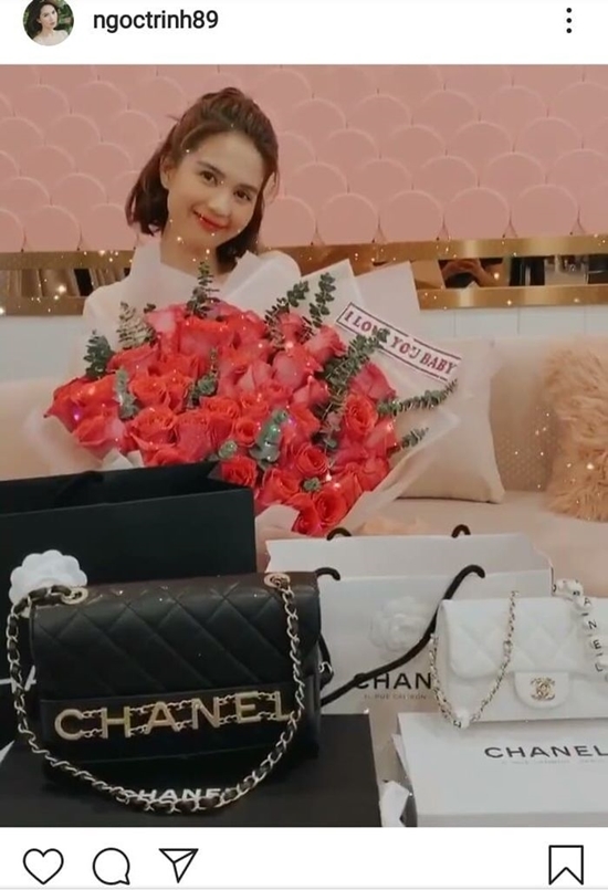 "Nữ hoàng nội y" của showbiz Việt đã chia sẻ một đoạn video ngắn về những món quà mới được tặng, trong đoạn video, Ngọc Trinh ôm một bó hoa "khủng" kèm giấy nhắn vô cùng tình cảm "I love you baby", bên cạnh đó là hai chiếc túi xách hàng hiệu được kèm theo. Trên trang cá nhân của mình, Ngọc Trinh viết: "Hoa rất đẹp, quà rất ưng, cám ơn nhóc". Lời chia sẻ của cô nàng hiện đang khiến dân tình "đoán già đoán non" rằng sau thời gian dài yêu người lớn tuổi, liệu người bạn trai bây giờ của Ngọc Trinh có phải là một người nhỏ tuổi hơn cô.