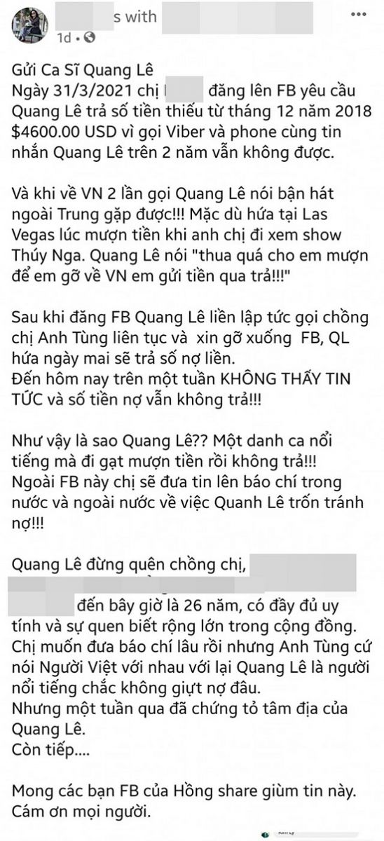Mãi đến ngày 31/3/2021, không còn cách nào khác, người quen này đành đăng bài lên Facebook yêu cầu Quang Lê hoàn trả số tiền.