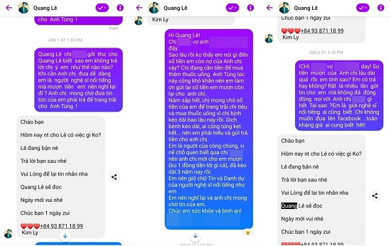 "Sau khi đăng Facebook, Quang Lê liền tập tức gọi điện cho chồng chị anh T. liên tục và xin gỡ xuống khỏi Facebook, Quang Lê hứa ngày mai sẽ trả số nợ tiền. Đến hôm nay là trên một tuần không thấy tin tức và số tiền nợ vẫn không thấy trả", người này bức xúc cho hay.