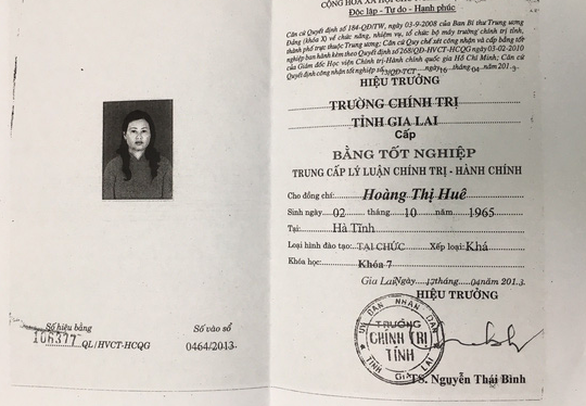 Bên cạnh đó, bà Hoàng Thị Huê sẽ bị thu hồi bằng tốt nghiệp có số vào sổ là 0464/2013, do trường Chính trị tỉnh Gia Lai cấp ngày 17/4/2013, hệ tại chức.