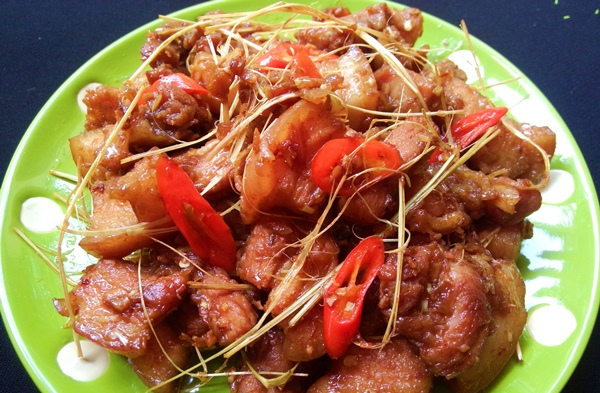 1. Đĩa thịt rang có màu nâu cánh gián do thịt được rang cháy cạnh và màu của nước hàng, sự hòa quyện màu sắc của thịt heo màu nâu, sả chiên vàng và ớt đỏ tươi rất bắt mắt.