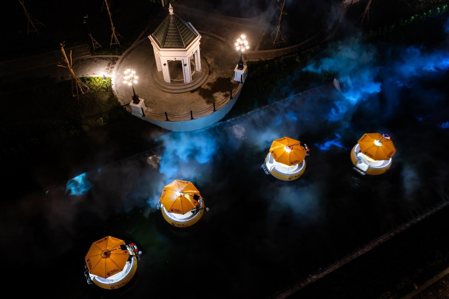 Ngồi trên thuyền, du khách như lạc vào một miền cổ tích huyền ảov ới hơi sương mát lạnh bồng bềnh xung quanh. Sương ôm ấp quanh khách, rồi cuộn lên, in lên nền ánh sáng laser, tựa như những đám mây đang lừng lững trôi đi trên bầu trời xanh ngăn ngắt.