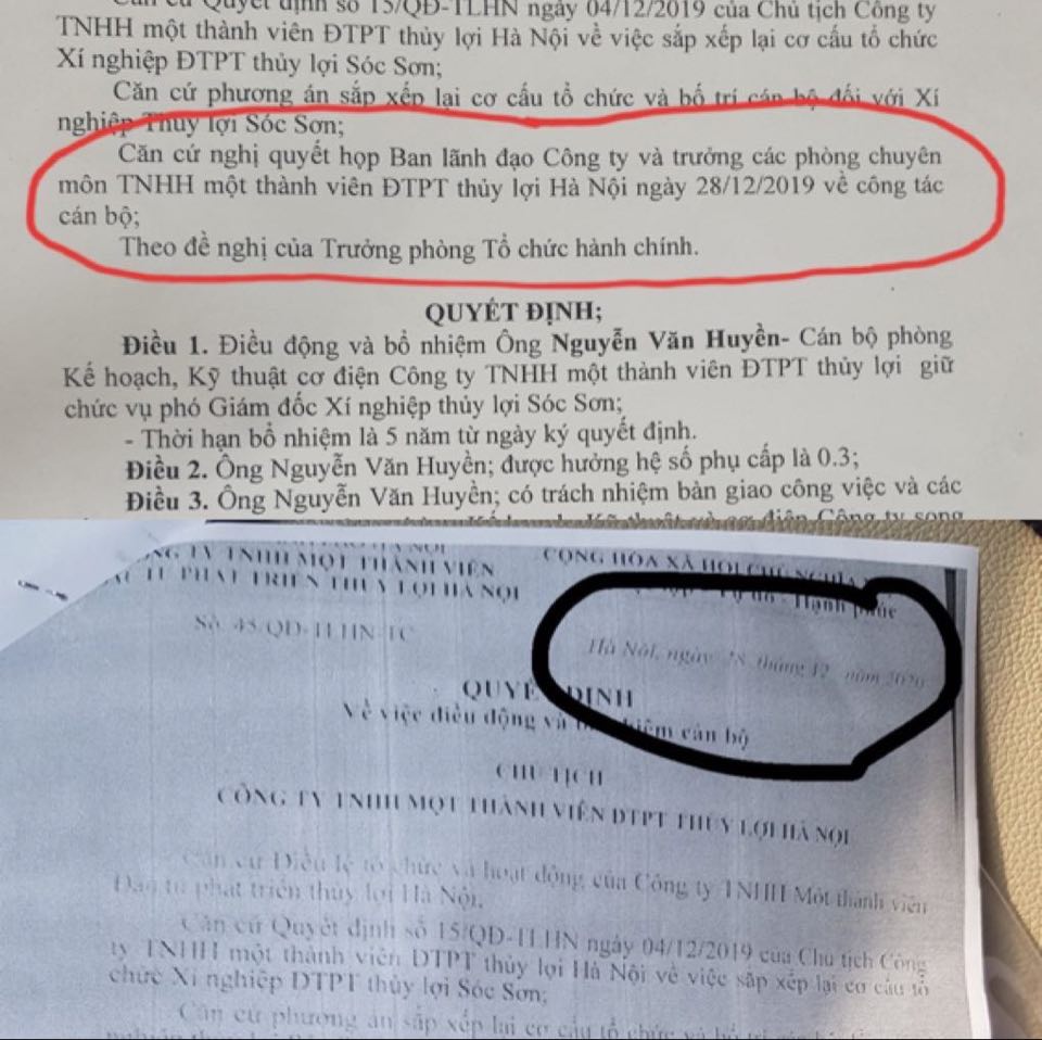 Theo một cán bộ của Công ty Thủy lợi Hà Nội (xin được giấu tên) cho biết: “Đến hết năm 2019, ông Nguyễn Văn Huyền không nằm trong danh sách cán bộ quy hoạch cấp phòng được công ty phê duyệt, nhưng không hiểu vì lý do gì, ông Hội lại bổ nhiệm ông Huyền về làm Phó Giám đốc xí nghiệp nước Sóc Sơn. Trong khi đầu năm 2019, cơ sở Sóc Sơn gửi đề nghị lên Công ty Thủy lợi Hà Nội yêu cầu bổ sung cán bộ lãnh đạo, đến giữa năm 2019 có gửi lại đề nghị lần nữa. Người được cơ sở đề xuất bổ nghiệm là bà Loan - cán bộ công tác lâu năm, có kinh nghiệm tại Xí nghiệp, tuy nhiên là bà Loan không được bổ nhiệm”.