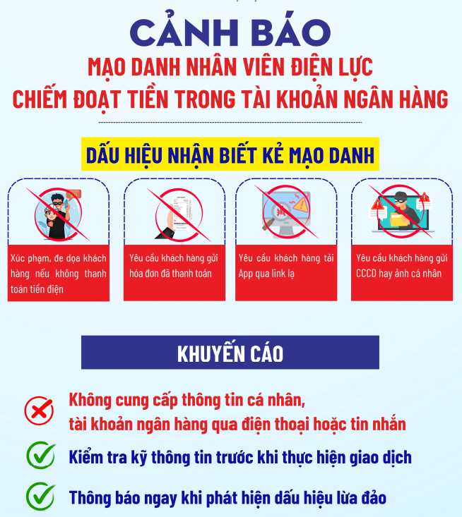 Theo đó, đối tượng lừa đảo thường gọi điện đến khách hàng, giới thiệu là nhân viên ngành điện và yêu cầu truy cập các đường link lạ, cài đặt các ứng dụng giả mạo với thông tin không đúng. Các đối tượng yêu cầu khách hàng cung cấp thông tin tài khoản ngân hàng. Sau khi chiếm đoạt được thông tin, chúng sẽ thao tác các giao dịch gian lận, chiếm đoạt tiền trong tài khoản ngân hàng của khách hàng.
