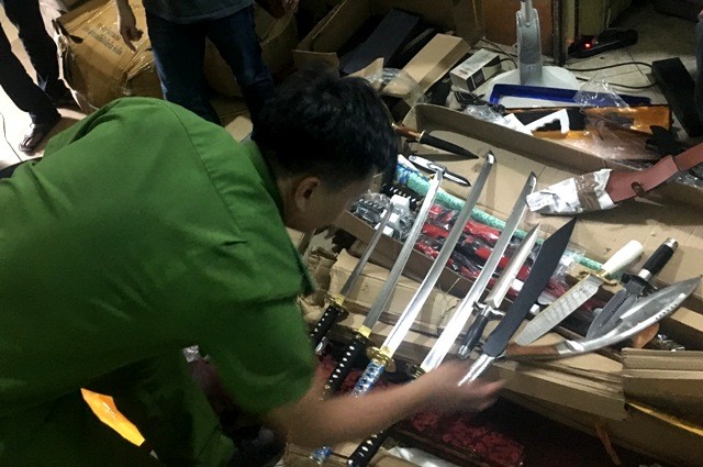 Qua kiểm tra, lực lượng Công an phát hiện trên xe đang chở nhiều loại vũ khí thô sơ gồm dao, kiếm, dao găm,.. và một số hàng hóa nhập lậu khác như quần áo, sữa, đồ chơi trẻ em, giày dép.