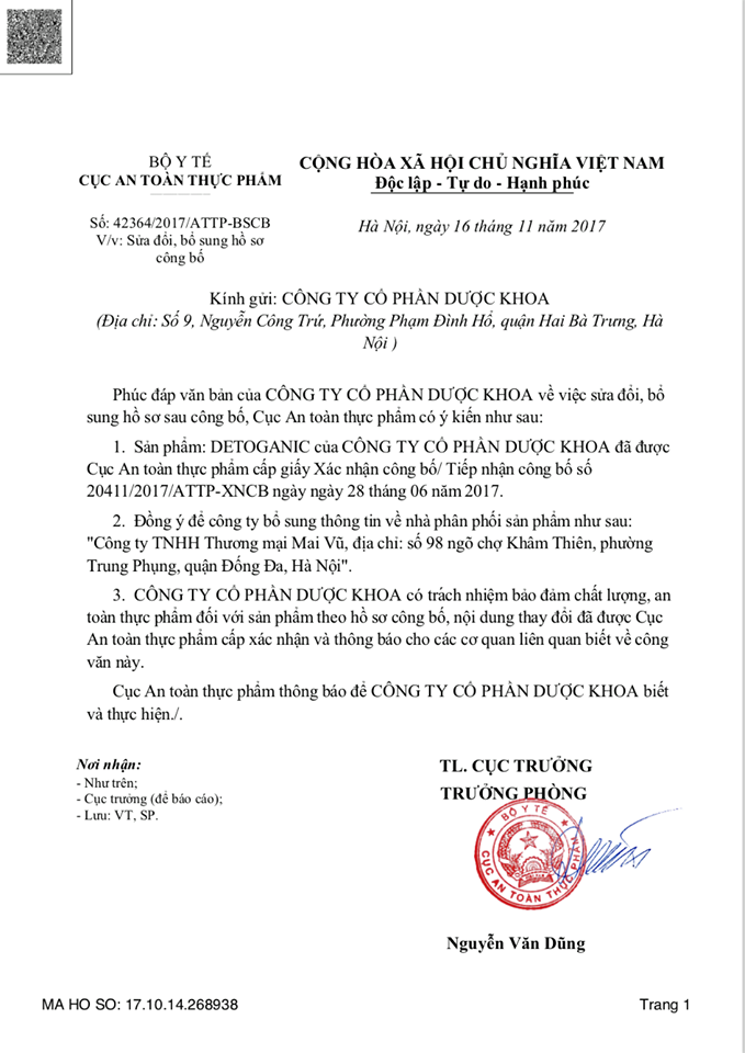 Theo văn bản số 42364/2017/ATTP-BSCB do Cục An toàn thực phẩm (Bộ Y tế), sản phẩm đang được phân phối bởi công ty TNHH Mai Vũ, địa chỉ số 98 ngõ chợ Khâm Thiên, phường Trung Phụng, quận Đống Đa, thành phố Hà Nội.