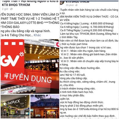 Từ những thông tin N. và T. cung cấp, chúng tôi thử vào nhóm Hội những người ở KTX khu A ĐHQG. Một nick Facebook có tên Cây Cổ Thụ đăng tuyển nhân viên bán hàng tại các chuỗi cửa hàng tiện lợi, đối tượng tuyển dụng là mọi thành phần, đặc biệt ưu tiên SV. Ca 4 giờ/ngày sẽ hưởng mức lương là 4,8 triệu đồng/tháng, ca 6 giờ/ngày sẽ hưởng mức lương 6,7 triệu đồng/tháng, ca 8 giờ/ngày mức lương 8,2 triệu đồng/tháng. Không chỉ lương cao mà khi đến làm việc còn được hưởng chế độ bảo hiểm theo quy định, bao ăn ở 100%, nếu không ở lại thì hỗ trợ 800.000 đồng tiền xăng xe.