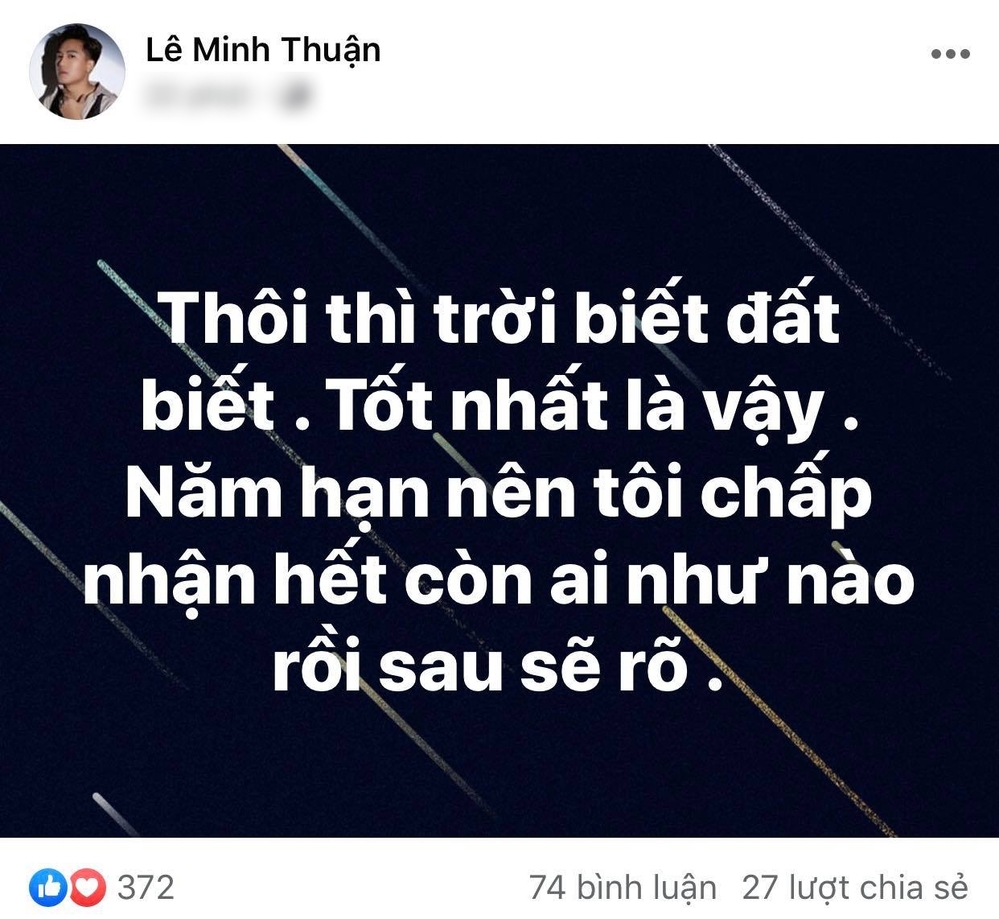 Ngoài ra trên trang cá nhân, Châu Khải Phong tiếp tục chia sẻ dòng status thể hiện sự mệt mỏi và buồn bã vì dính phải ồn ào vì dính phải ồn ào liên quan đến chuyện đời tư không đáng có. Anh viết: “Thôi thì trời biết đất biết. Tốt nhất là vậy, năm hạn nên tôi chấp nhận hết còn ai như nào rồi sau sẽ rõ!”.