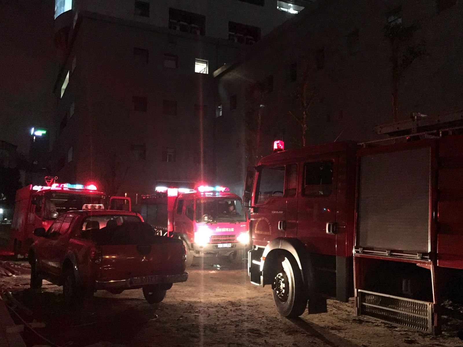 Bảo vệ và nhân viên y tế dùng bình cứu hỏa mini khống chế lửa, ngăn cháy lan. Cảnh sát điều 5 xe cứu hỏa tới hiện trường hỗ trợ. Dưới sân tòa nhà, bệnh nhân đứng ngồi chờ đợi, nhiều người hoảng hốt gọi cho người nhà báo tin cháy.