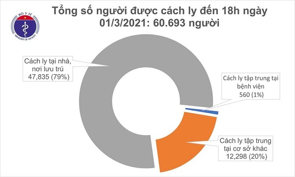 Số người cách ly: Tổng số người tiếp xúc gần và nhập cảnh từ vùng dịch đang được theo dõi sức khỏe (cách ly): 60.693, trong đó: