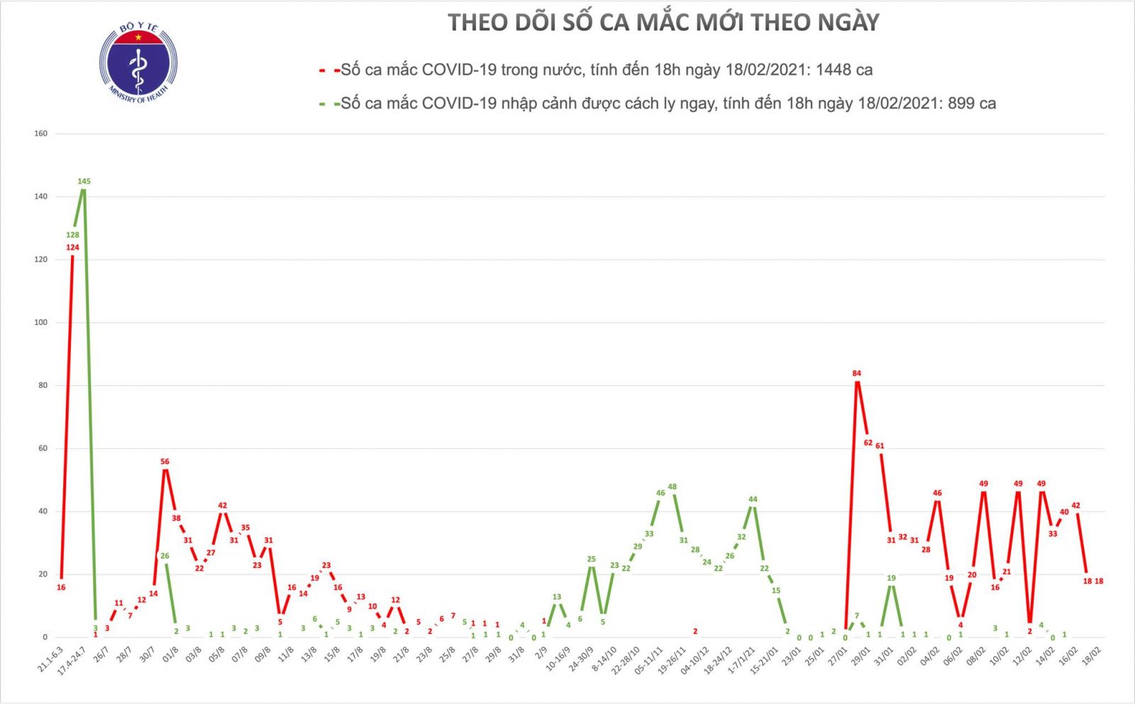 - Tính đến 18h ngày 18/02: Việt Nam có tổng cộng 1448 ca mắc COVID-19 do lây nhiễm trong nước, trong đó số lượng ca mắc mới tính từ ngày 27/1 đến nay: 755 ca.