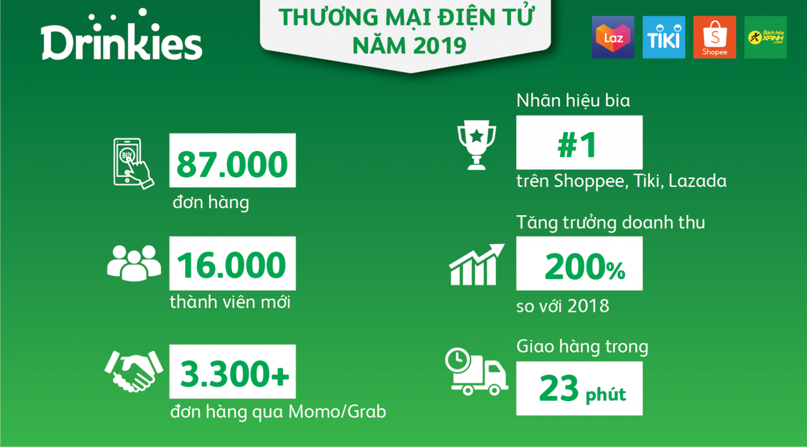 Ra đời năm 2018, Drinkies.vn là trang thương mại điện tử được phát triển bởi đối tác thương mại của HEINEKEN Việt Nam, giúp bán hàng trực tiếp tới người tiêu dùng ở các thành phố lớn: TP. HCM, Hà Nội và Đà Nẵng. Trước đó, HEINEKEN Việt Nam cũng đã sớm hợp tác với các kênh bán lẻ trực tuyến hàng đầu tại Việt Nam như Lazada, Tiki, Shopee và Bách Hóa Xanh Online.