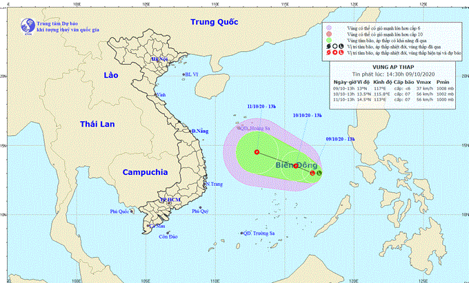 Theo bản tin của Trung tâm Dự báo Khí tượng thủy văn Quốc gia, lúc 13 giờ ngày 9/10, vị trí trung tâm vùng áp thấp ở vào khoảng 12,5-13,5 độ Vĩ Bắc; 116,5- 117,5 độ Kinh Đông, cách đảo Song Tử Tây khoảng 360km về phía Đông Bắc.